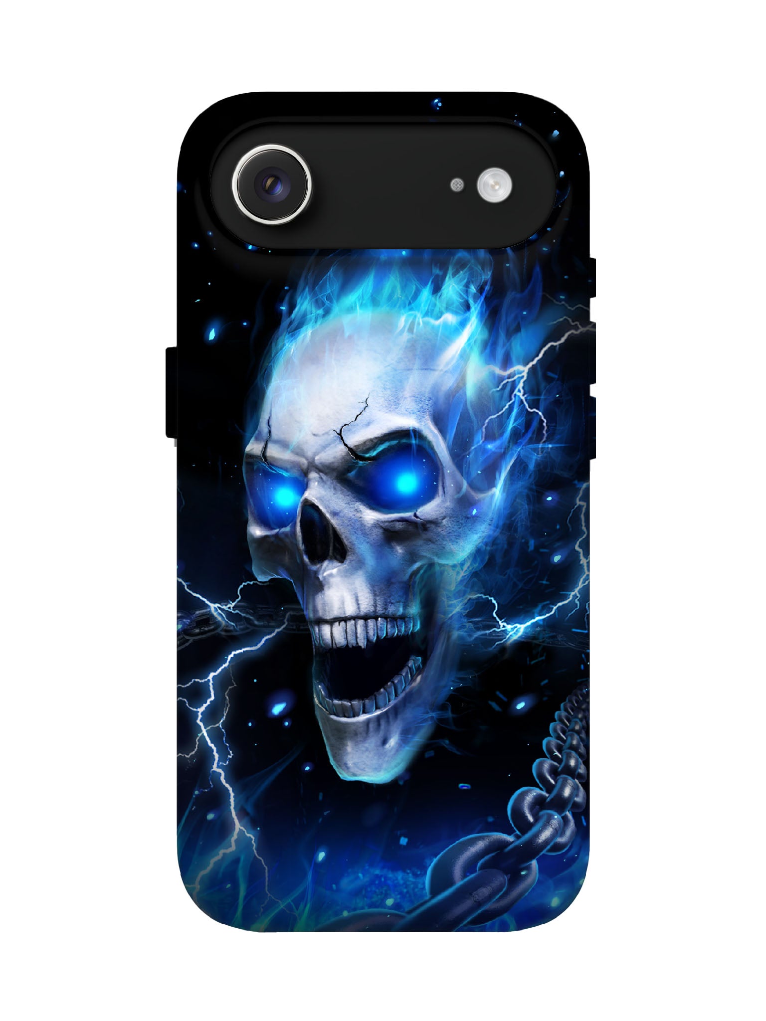 A cracked skull erupts in electric blue hellfire, eyes blazing with neon-cold fury, lightning fracturing the void around it. Chains coil from its jaw into the abyss, while cosmic sparks and plasma trails swirl across a pitch-black backdrop—raw, chaotic, and unapologetically dark.