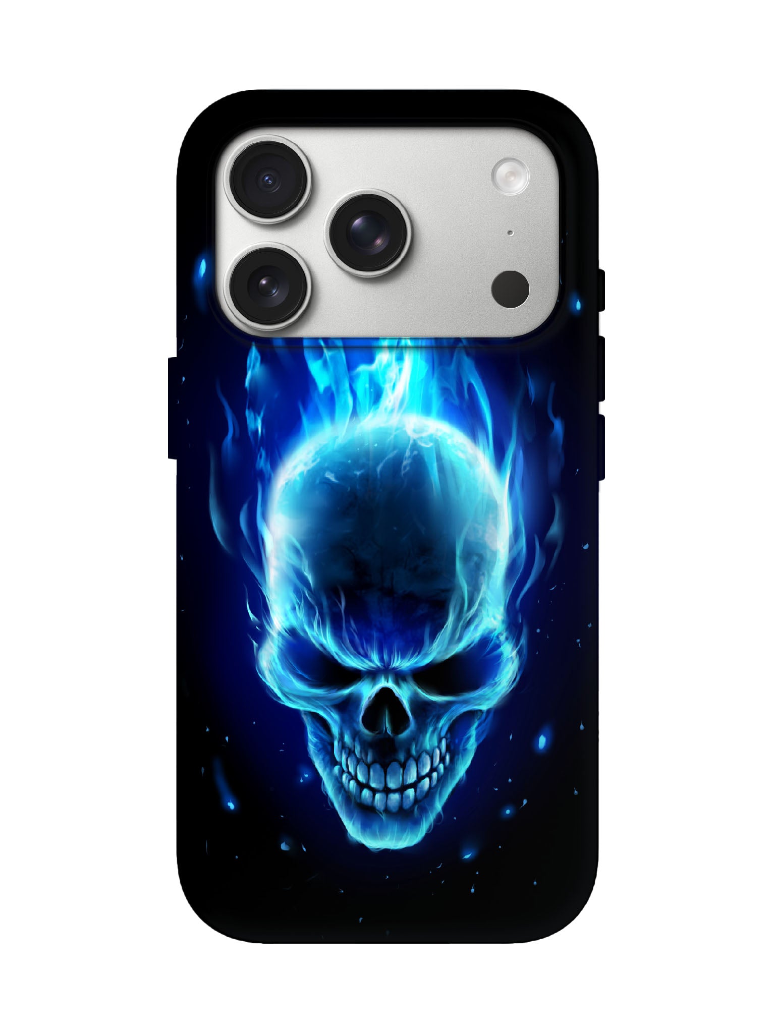A searing neon-blue skull erupts in electric flame against a void-black backdrop—cracked bone texture, glowing fissures, and icy fire particles suspended mid-blast. The design screams raw power: jagged edges, deep shadow contrast, and a glossy finish that amplifies the inferno’s intensity.