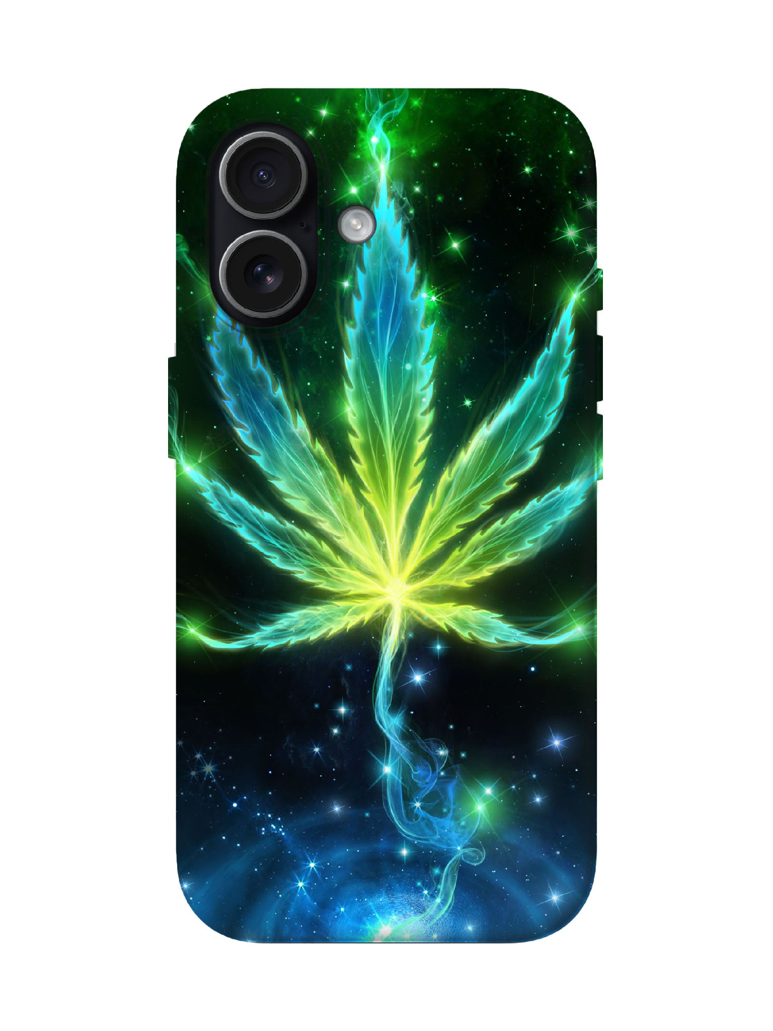 A radiant neon cannabis leaf—electric lime core bleeding into cyan flames—erupts from a cosmic void of deep emerald and indigo stardust. Sharp, glowing edges slice through the night; swirling smoke trails down like plasma lightning, all printed in ultra-vivid, scratch-resistant detail on a matte-finish shell.
