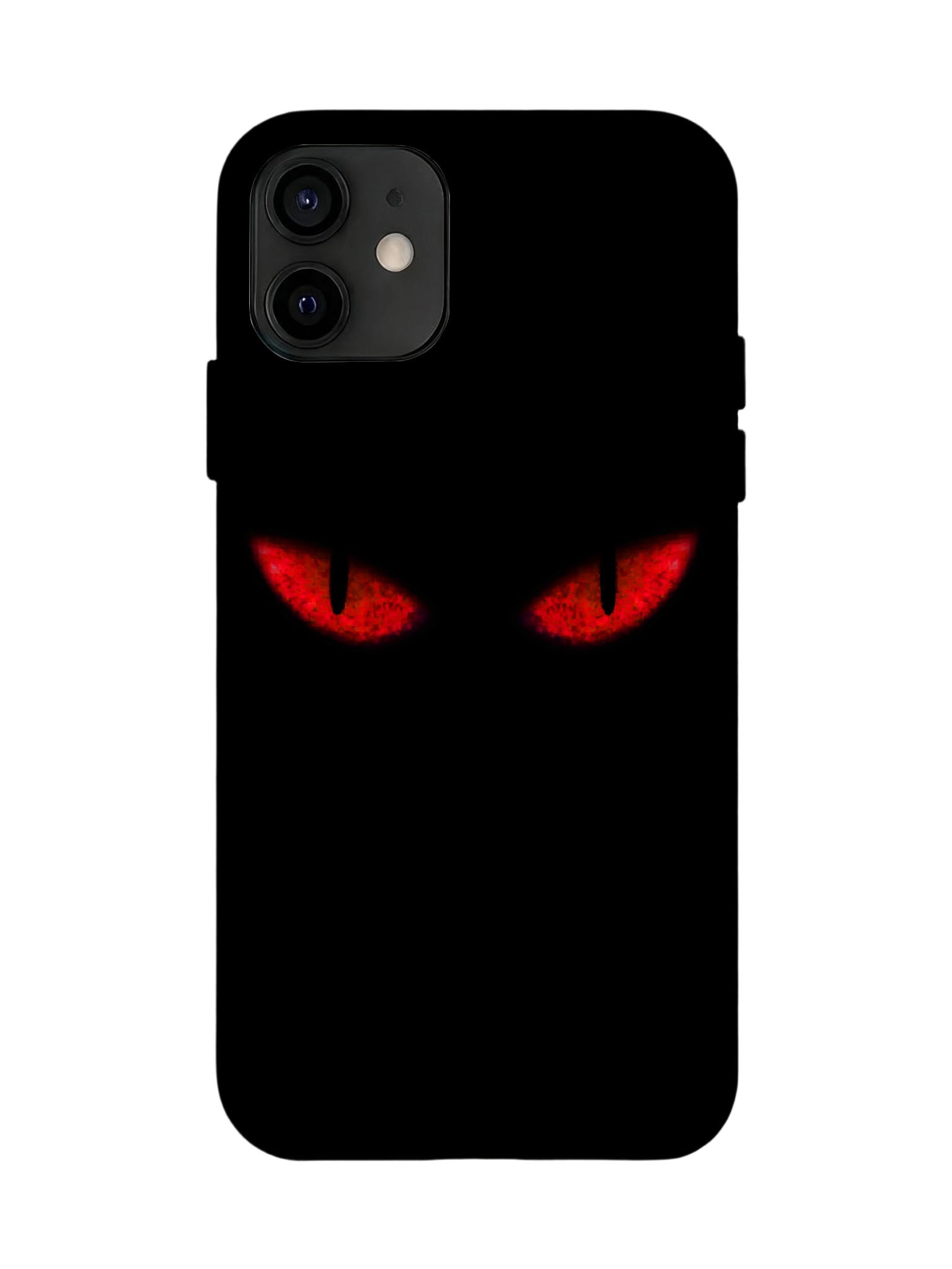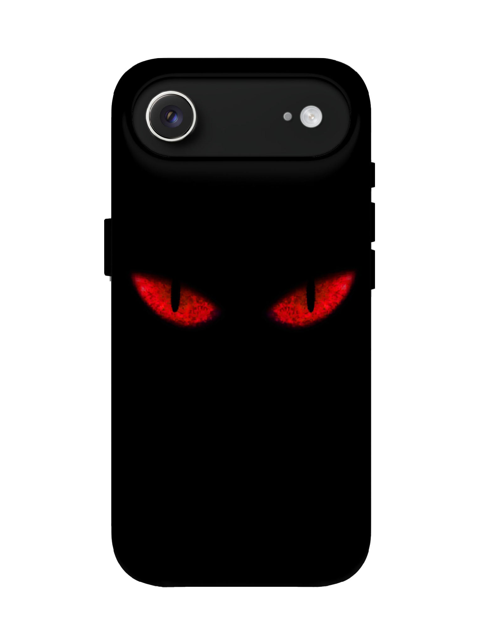 A pitch-black case stares back with glowing crimson eyes—slitted, feral, and crackling with neon-red static texture. No face, no form—just raw menace in the dark, evoking ancient dread and digital horror. Matte finish enhances the void-like depth; the eyes pulse like embers in a tomb.