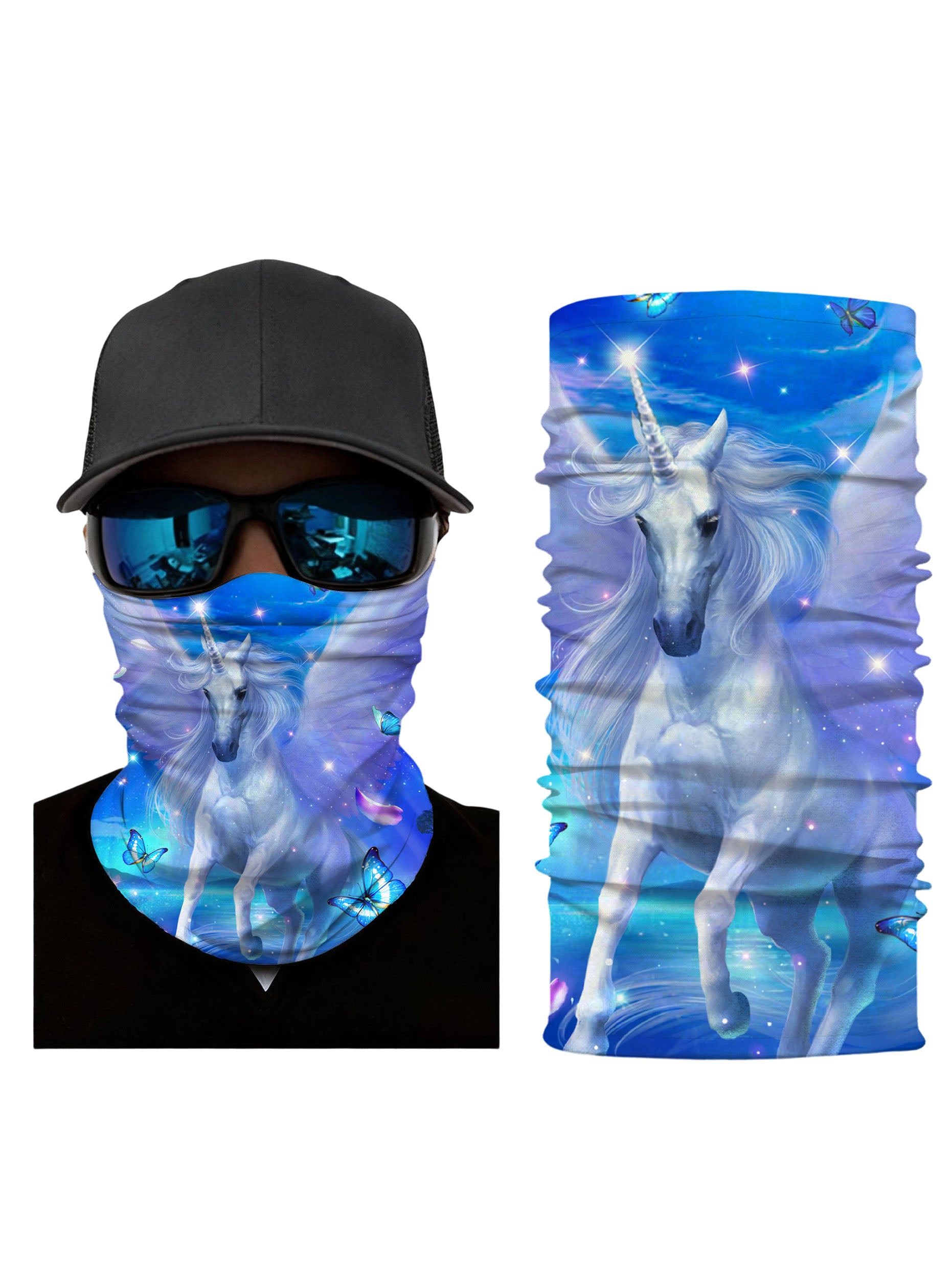 Neck Gaiter with 3D all over print featuring mystical unicorn and glowing blue butterflies, Aesthetic fantasy design, unisex soft stretchy fabric for outdoor wear