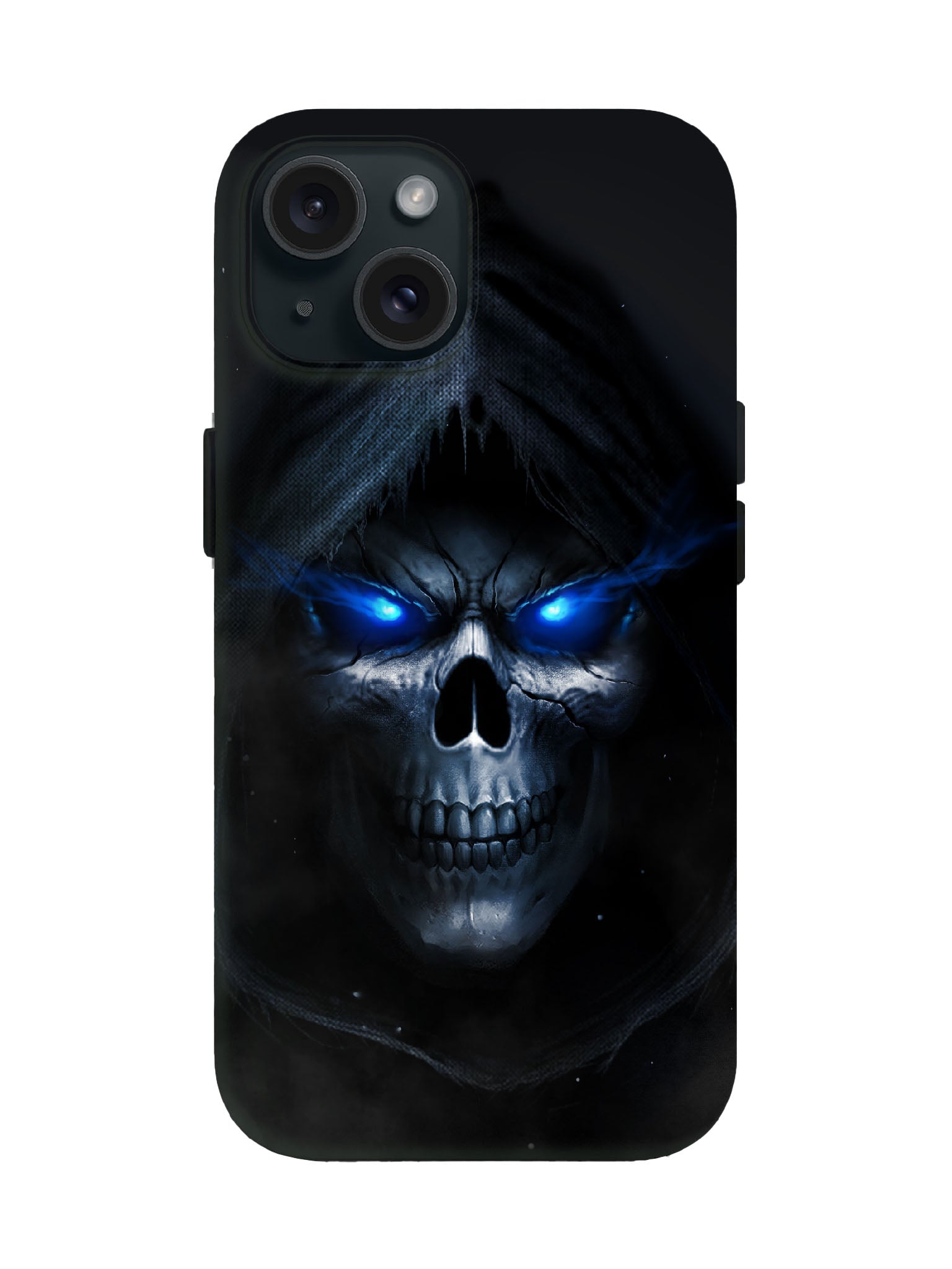 A hooded death skull glares with searing electric-blue eyes, crackling energy flaring from its sockets against a void-black backdrop. Jagged bone texture and deep shadowing give the design a gritty, high-contrast finish—matte black case surface amplifies the neon glow and raw menace.