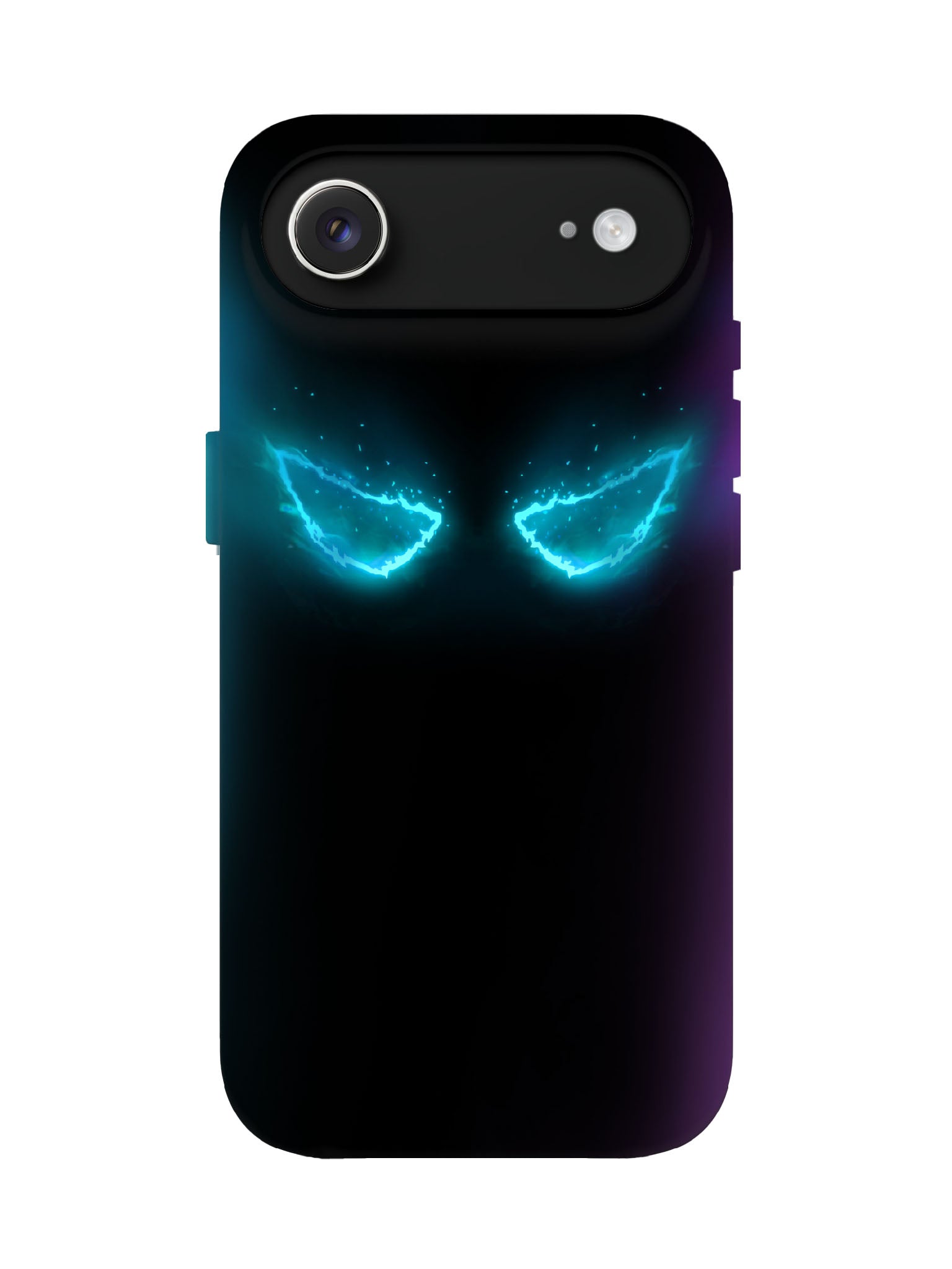 Glowing cerulean eyes slash through inky blackness—sharp, jagged, and electric—framed by a deep violet-to-teal gradient fade. No face, no mercy: just twin voids crackling with neon fury, like a demon’s stare locked onto your soul. Matte finish hides fingerprints; the design pulses with silent intensity.