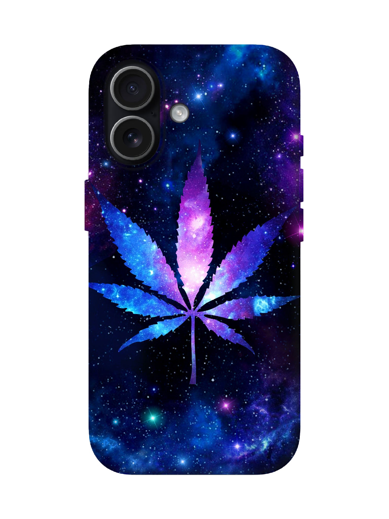 A cosmic cannabis leaf blazes across deep-space voids—nebulae of electric violet, sapphire, and magenta swirl through its serrated edges, stardust glittering like shattered glass. The silhouette glows with inner supernova light, contrasting stark black voids and radiant stellar clusters. This isn’t decor—it’s a declaration: psychedelic rebellion forged in galactic fire.