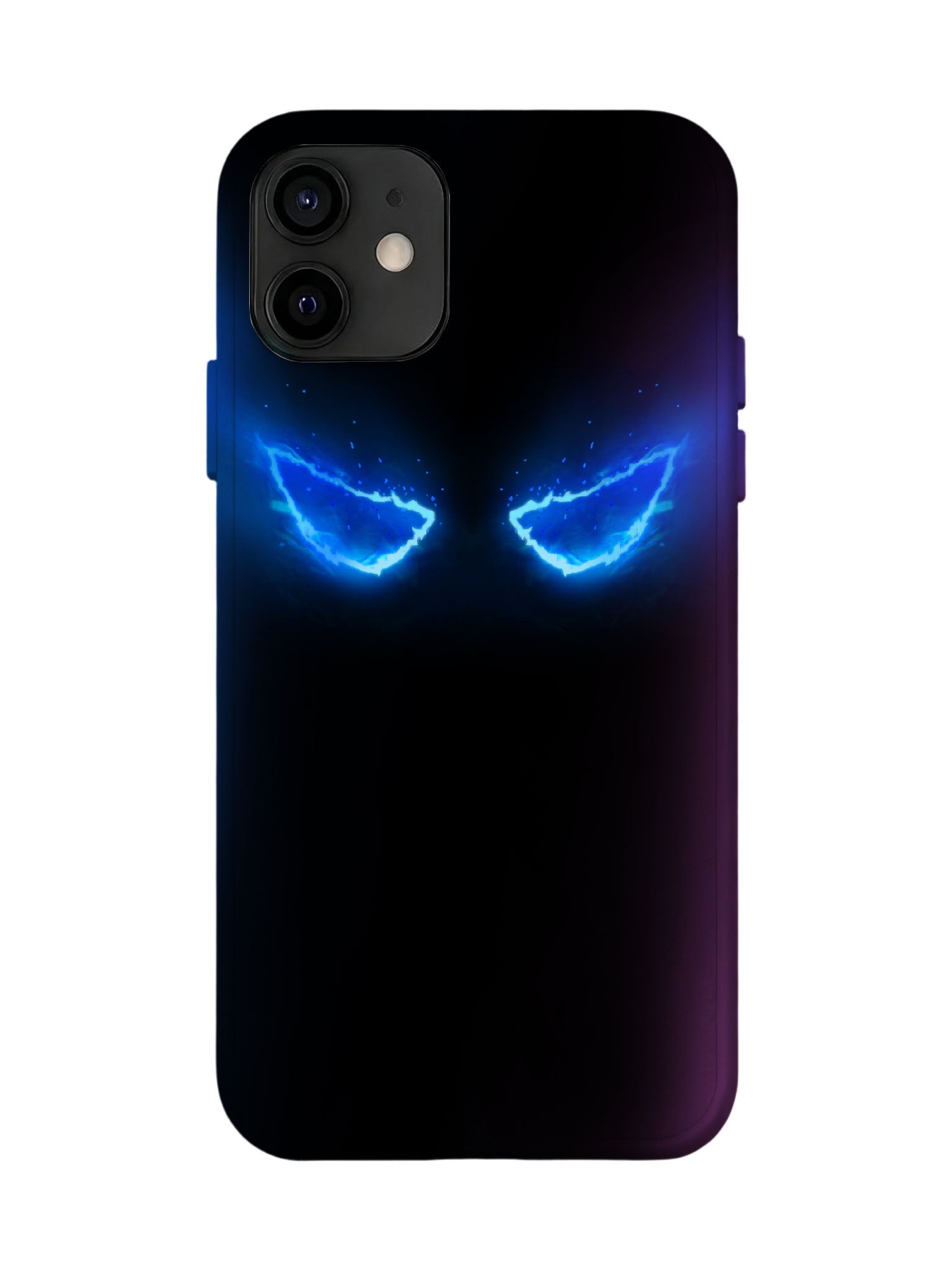 Glowing electric-blue demon eyes slash through a deep black-to-violet gradient backdrop, crackling with neon energy and particle sparks—sharp, jagged pupils radiate menace. The matte-finish surface enhances the luminous contrast, turning your phone into a weaponized artifact of digital darkness.